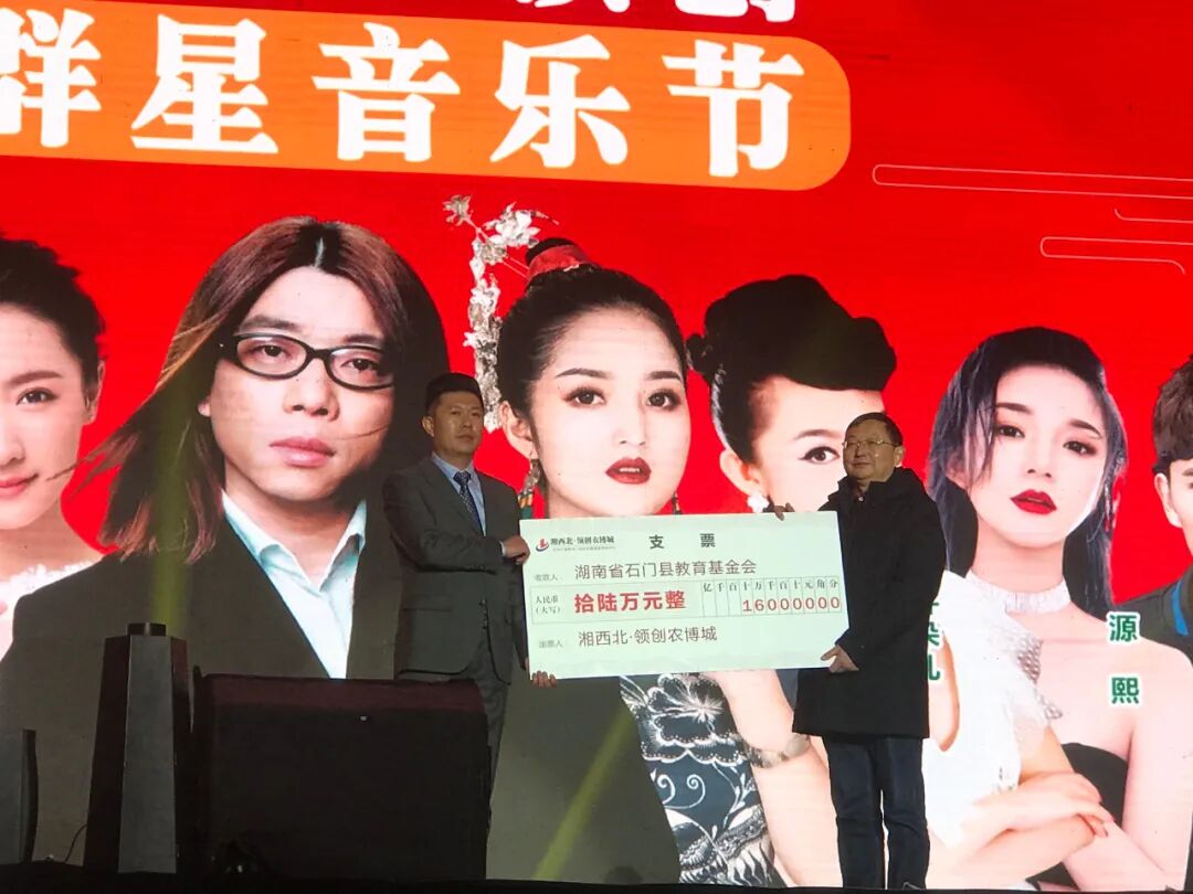 湘西北·领创农博城执行董事林富强代表湘西北·领创农博城为石门县4所学校捐款共计16万元整,由湖南省石门县教育基金会理事长袁黎明亲自代表4所学校领取。两位领导合影留恋,活动正式开始!